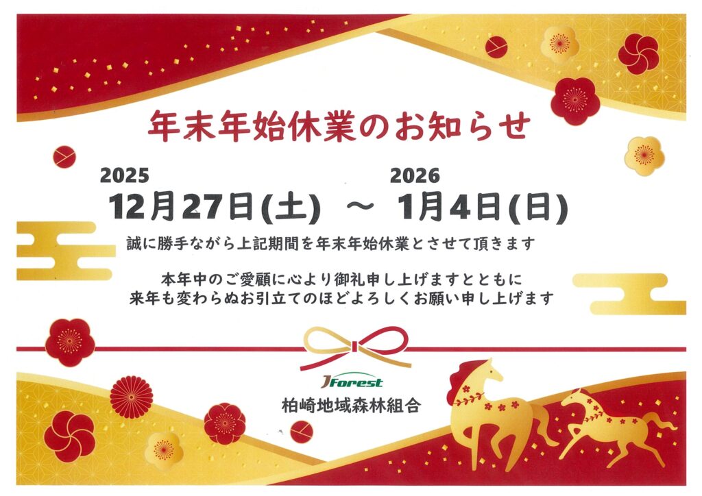 2025年12月25日 / 最終更新日 : 2025年12月25日 kashiwazaki-fa-editor お知らせ 年末年始休業のお知らせ 12月27日(土)~1月4日(日)の期間は年末年始休業とさせていただきます。新年は1月5日(月)より通常営業いたします。 皆さま、どうぞ良いお年をお迎えください。 FacebookXBlueskyHatenaCopy